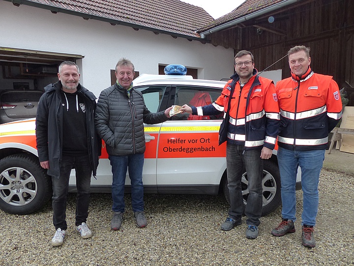 Beim letzten Schierlinger Musikanten-Stammtisch beschlossen die Anwesenden, eine Spende an die Oberdeggenbacher Helfer vor Ort (HvO) zu geben. Anlass war ein Zwischenfall beim Stammtisch, bei dem die HvO innerhalb von wenigen Minuten da waren. Bei der spontanen Sammlung kamen insgesamt 250 Euro zusammen. Diese Spende übergaben jetzt Heinz Langenmantel für die Musikanten und Uwe Meier für die Zuhörer an Thomas Treintl und Alex Tippold. |