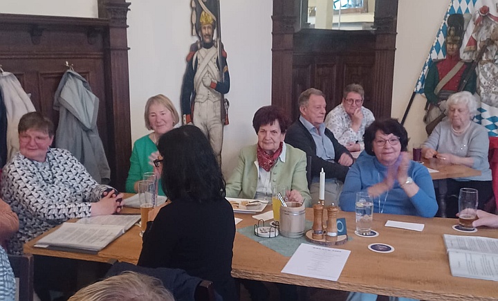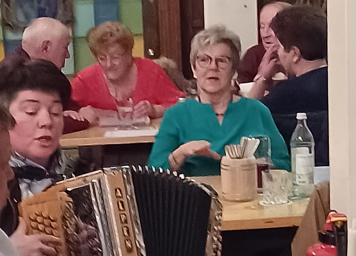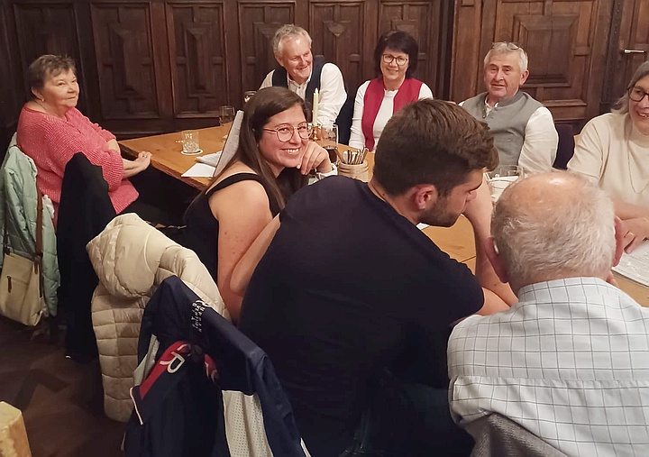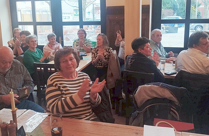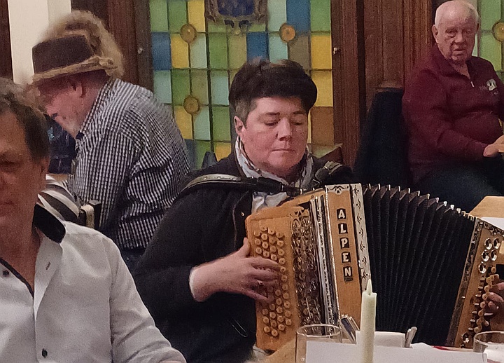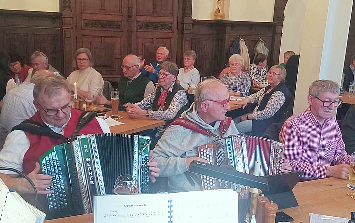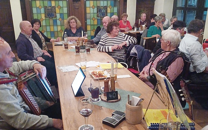 Sie spielten mit Steirischen Harmonikas und Gitarren reihum oder zusammen schöne altbekannte Ohrwürmer, Schlager und Hits zum Mitsingen, zum Lachen, zum Schunkeln oder einfach nur zum Zuhören. Dank der ausgeteilten Texthefte konnten die Besucher bei vielen Liedern mitsingen. Dazwischen gab es Lachmuskel-Training mit Witzen. Die Musikanten bekamen viel Applaus für ihre Stücke, auch Lisa Schmid, die zum ersten Mal bei diesem Stammtisch war. |