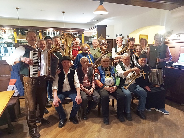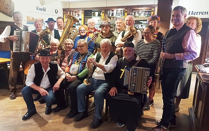 Beim Schierlinger Musikanten-Stammtisch war der Saal im Bräustüberl bis auf den letzten Platz besetzt. Die Musikanten verteilten sich im ganzen Raum und spielten reihum Faschings-, Wirtshaus- und Schunkellieder. Zwischendurch sorgten Witze noch zusätzlich für Stimmung. |