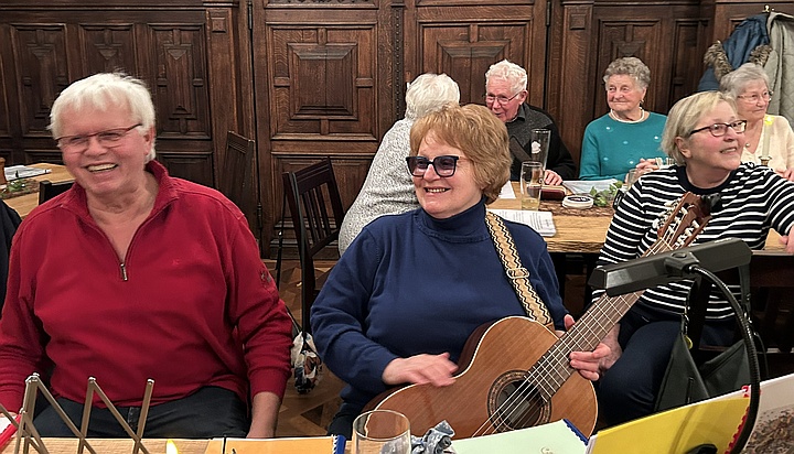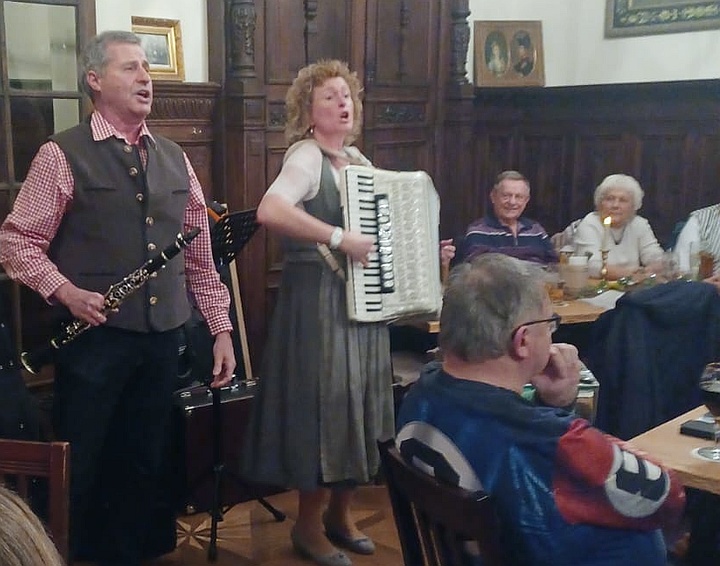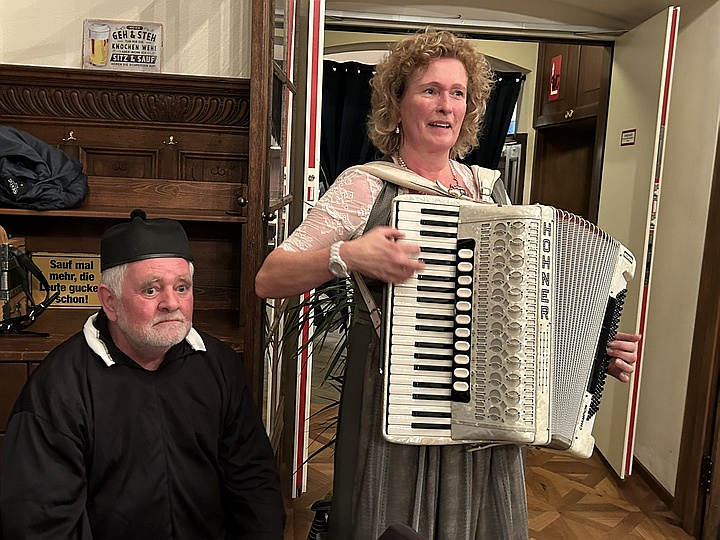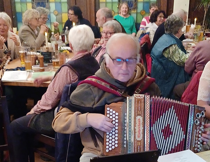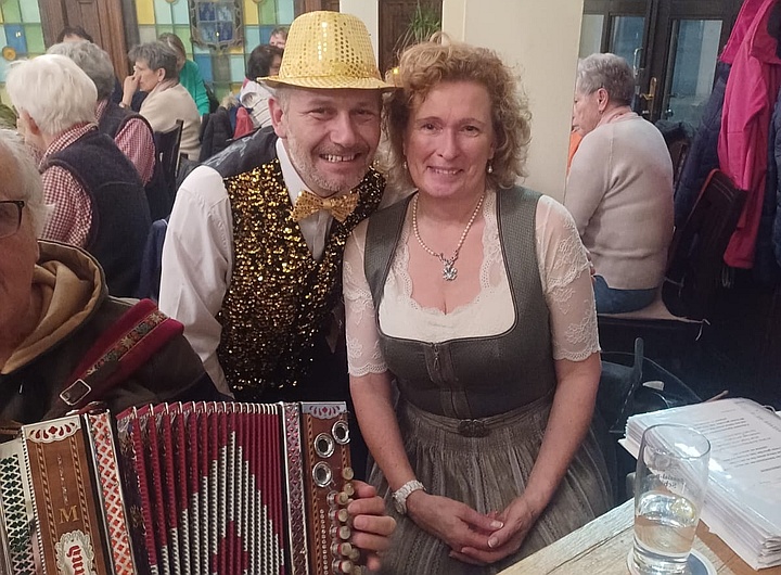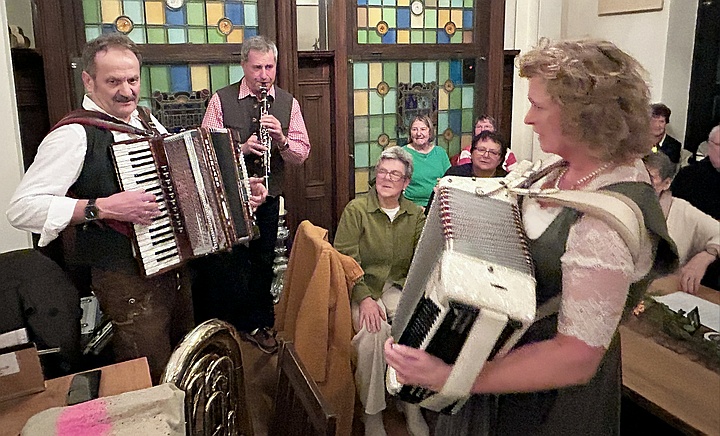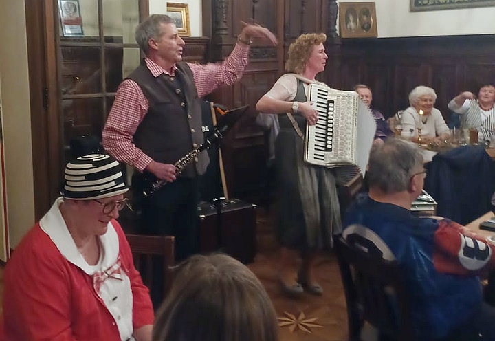 Die Musikanten spielten mit ihren Steirischen Harmonikas, Akkordeons, Gitarren, Blechblasinstrumenten und Klarinette Gaudi-Lieder zum Zuhören und Lachen sowie bunte Lieder zum Mitsingen, zum Schunkeln und zum Tanzen. Außerdem gab es noch ein paar Witze von Margit, Sonja und Ossi. Mit Hilfe der ausgeteilten Texthefte sangen die Besucher bei vielen Liedern gerne mit. Lieder wie „S' Leben is wia a Eintopf“, „Der Schweinetango“, „Schierling – Perle der Oberpfalz“, „In Junkers Kneipe“ oder „Schunkelwalzer-Potpourri“ trugen zur tollen Stimmung bei, genauso wie die Witze, unter anderem über ein Beichtstuhl-Ereignis, Pinguin-Ausflüge oder Präsidenten auf dem Kamel. |
