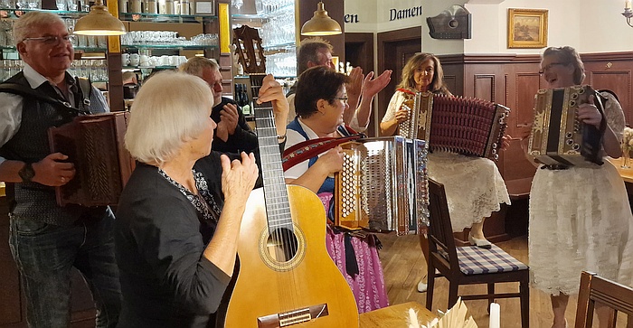 Mit Steirischen Harmonikas und Gitarren spielten die Musikanten abwechselnd oder zusammen für die Anwesenden. Wie immer wurden Texthefte zum Mitsingen ausgeteilt, was die Gäste gerne annahmen. Gespielt und gesungen wurde unter anderem über den steirischen Brauch oder „de boarischen Berg“ und „ois bloß koa Wasser ned.“ Ossi Wendl erzählte auch wieder mal fleißig Witze, zum Beispiel von einem Jungbauern, der sich einen Hof kaufen wollte, oder von einem Gockel, der versehentlich eine Ente getreten hat. Die „Isartaler Bixn“ Iris Reisky und Romy Casutt spielten mit ihren Steirischen und auch mal mit einer Gitarre auf. Sie sangen von einem Gartenhäusl, vom alten Jäger, einen slowenischen Bauerntanz und andere Lieder. Iris Reisky kündigte am nächsten Tag auf ihrer Facebook-Seite an, dass sie zum Advent-Stammtisch wiederkommen werden. Sie schreibt: „Da gibt's Stille Nacht mit Steirischer, Hackbrett und Zither ... Gänsehaut pur.“ Dafür wird Romy Casutt mit der Steirischen spielen, Iris Reisky mit dem Hackbrett und Inge Heinrich mit der Zither. Weil manche Musikanten und Besucher den nächsten Stammtisch kaum erwarten können, wurde am Ende des Abends gleich der neue Termin vereinbart. Der nächste Musikanten-Stammtisch im Schierlinger Bräustüberl ist am Samstag, 03.12.2022, ab 19 Uhr. Platzreservierung für Musikanten und Besucher ist möglich unter der Telefonnummer 09451/9488440. |