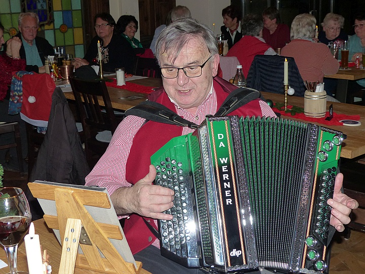 Nach der besinnlichen Stunde spielten die Musikanten wie immer Lieder zum Zuhören, zum Mitsingen, zum Schunkeln und zum Tanzen, außerdem gab es noch ein paar Witze von Ossi. Mit Hilfe der ausgeteilten Texthefte sangen die Besucher bei vielen Liedern gerne mit. |