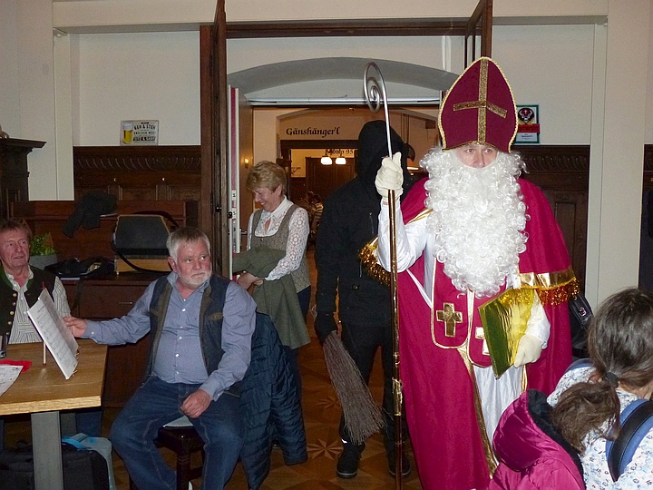 Einige der Besucher hatten vorher beim Nikolausmarkt schon eingekauft und einen Glühwein getrunken. Dann genossen sie die gemütliche Stimmung beim Musikanten-Stammtisch im Bräustüberl. Heinz Langenmantel begrüßte die Gäste und stellte die Musikanten des Abends vor. Außer ihm spielten und sangen noch Christa und Albert Eschlbeck, Marille Gangl, Werner Grünauer, Helmut Meinl, Maria Steinhauser und Ossi Wendl. |