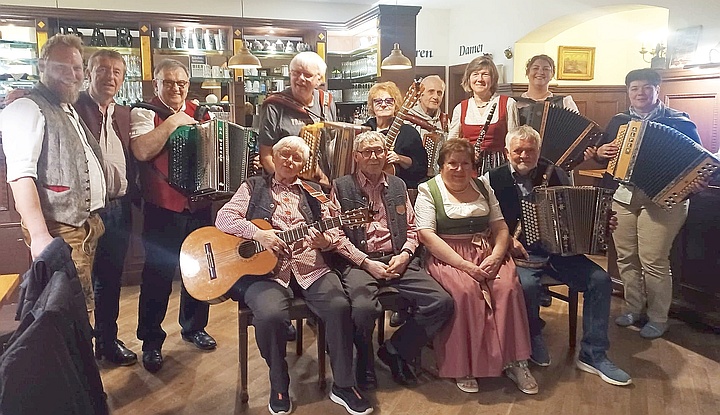Für Unterhaltung beim Musikanten-Stammtisch im April sorgten sitzend: Margit Hierlmeier, Thomas Maierthaler, Marille Gangl, Ossi Wendl (sitzend von links) sowie Wirt Sebastian Frankhof, Heinz Langenmantel, Werner Grünauer, Albert Eschlbeck, Christa Eschlbeck, Helmut Meinl, Maria Steinhauser, Andrina Hüttner, Lisa Schmid (stehend von links). |