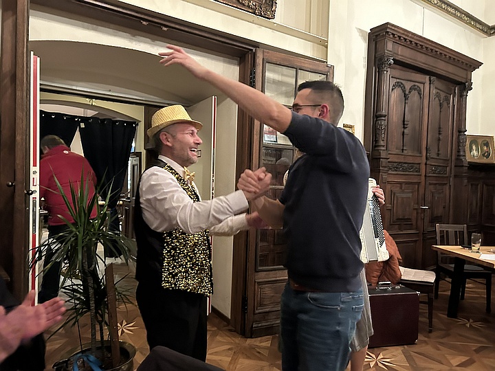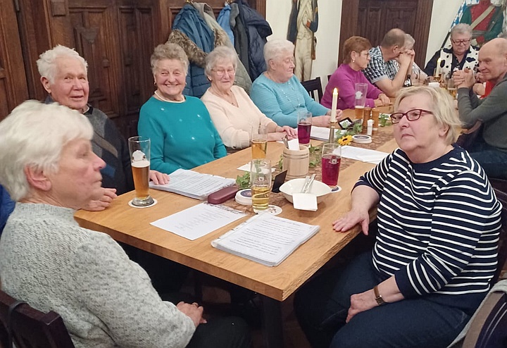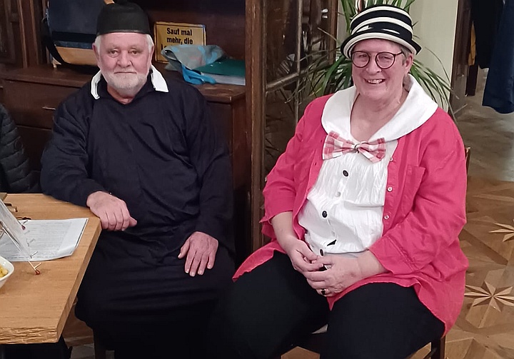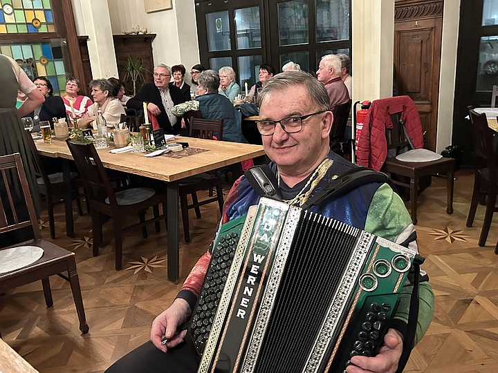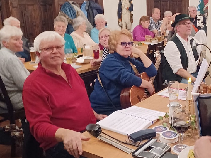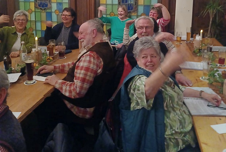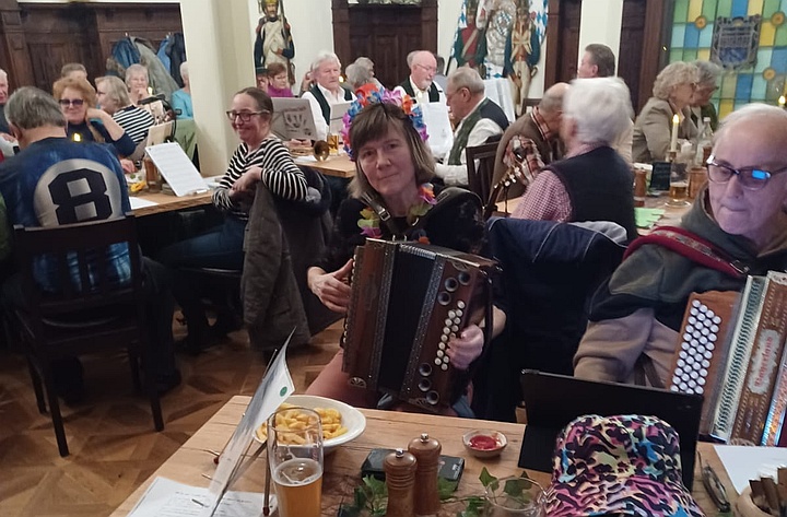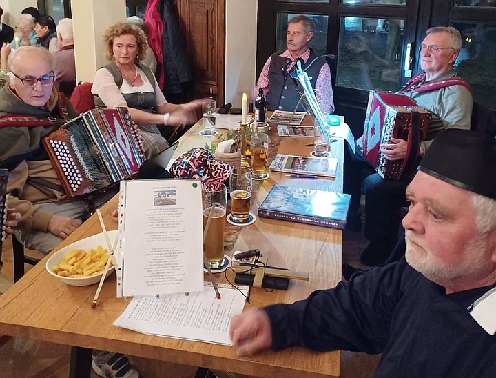 Die Musikanten spielten mit ihren Steirischen Harmonikas, Akkordeons, Gitarren, Blechblasinstrumenten und Klarinette Gaudi-Lieder zum Zuhören und Lachen sowie bunte Lieder zum Mitsingen, zum Schunkeln und zum Tanzen. Außerdem gab es noch ein paar Witze von Margit, Sonja und Ossi. Mit Hilfe der ausgeteilten Texthefte sangen die Besucher bei vielen Liedern gerne mit. Lieder wie „S' Leben is wia a Eintopf“, „Der Schweinetango“, „Schierling – Perle der Oberpfalz“, „In Junkers Kneipe“ oder „Schunkelwalzer-Potpourri“ trugen zur tollen Stimmung bei, genauso wie die Witze, unter anderem über ein Beichtstuhl-Ereignis, Pinguin-Ausflüge oder Präsidenten auf dem Kamel. |